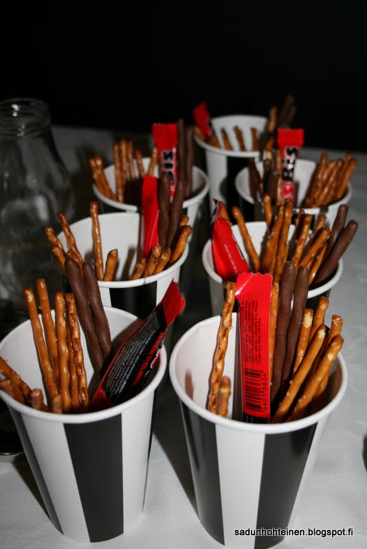 Tällä kertaa tarjoiluastioiden suhteen mentiin musta-valko -teemalla ja kaupasta löytyi riittävän sopivia, itse en tehnyt niistä yhtäkään.